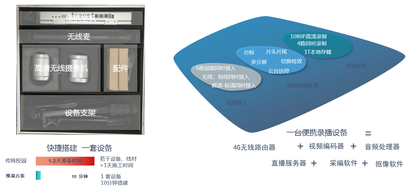 便携式移动录播主机体积小、质量轻,主机高度小于1.5U,整机重量小于4kg。一套便携式移动录播系统只需一个可移动式箱子即可完成装载(包括主机、摄像机、支架、线材等所有设备在内),方便携带和搭建,具有可快速搭建、多场景应用的特性。不仅可以完成课堂实况的录制,还可以在实训场景、实验场景、会议场景、直播场景等情况下使用。较固定式录播课室而言具有通过较小投入却可满足多种使用要求的优势。