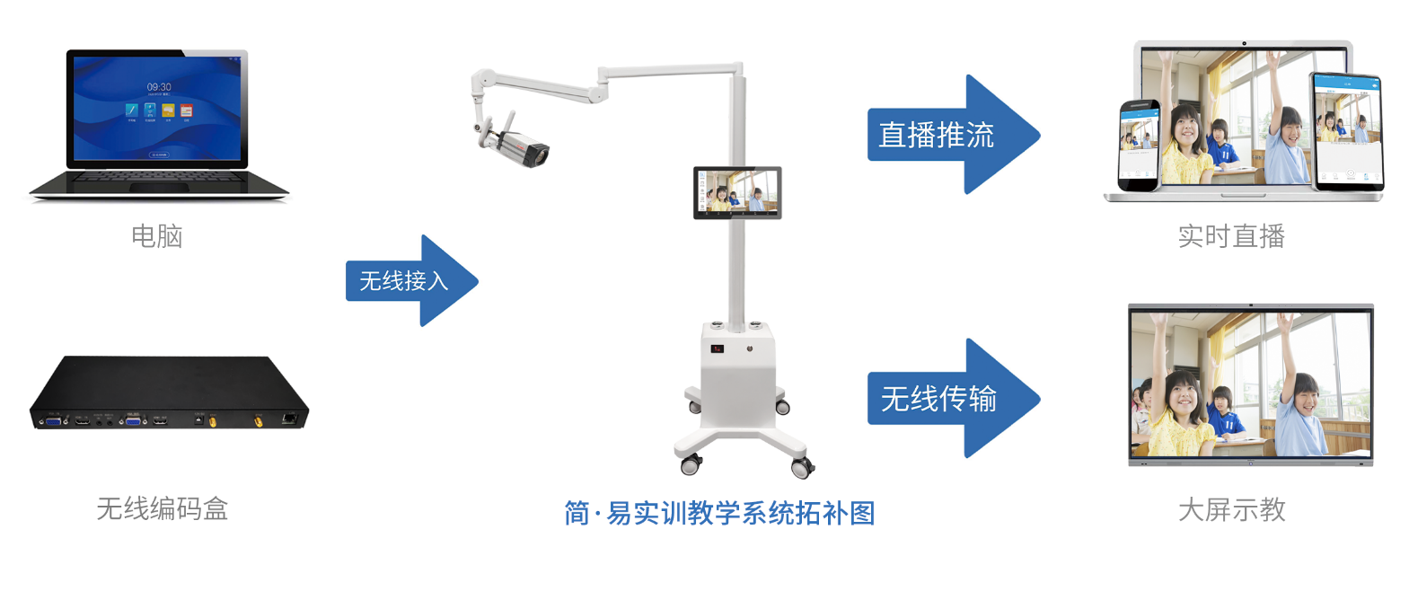 融合先进的高清音视频无线传输技术,简·易实训教学系统可搭配无线传输模块,视频输入无需通过视频线连接,即能轻松实现移动示教。